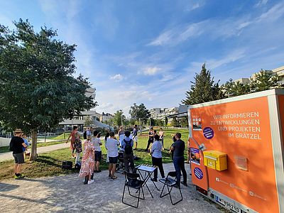 Seit 2012 ist die GB* mit dem Stadtteilmanagement auf den Aspanggründen aktiv, für die Bewohner*innen des bestehenden Eurogate ebenso wie für diejenigen, die sich für das neu entstehenden Village im Dritten interessieren. Anlaufstelle vor Ort für Interessierte ist der GB*Infopoint im Leon-Zelman-Park. Zwischen April und Oktober informiert das Team der GB* beim Treffpunkt Aspanggründe über die Entwicklung des Areals und nimmt Anregungen der Besucher*innen auf. Die jährlich stattfindende Nachbarschaftswoche ist ein fixer Bestandteil des Angebots, dieses Jahr findet sie von 30. Mai bis 2. Juni statt.